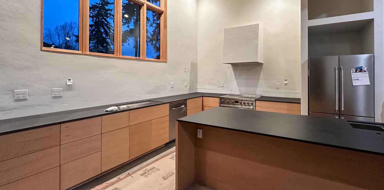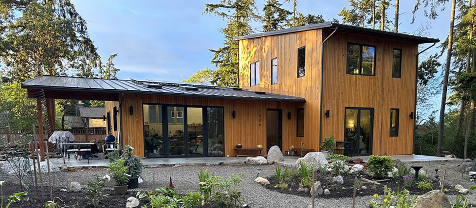 Our Studio & Residence is located in Port Townsend, WA. The house is clad in clear yellow cedar and orients to maximize solar gain for both interior lighting and heating. The Structure is constructed from 2x8 framing milled from onsite Douglas Fir timber. The large insulation cavity of the walls provides an R-31 value for a very energy efficient envelope. The vertical cedar rainscreen cladding protects the structure from the elements with optimizing drying and airflow. The raised patio and porch provide year-round functional exterior spaces. Onsite boulders and stones were incorporated into the exterior concrete work.. The 2000 sf residence was conceptually driven by both a desire to be up in the trees, while also rooted and connected to the site. Daylighting, views and access to the exterior spaces organized the layout or the 2 bedroom/2 bathroom floor plane.