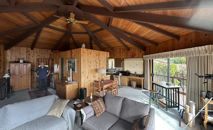 The scope of the project was to remodel an existing octagonal home located in Port Ludlow, WA. The project included a full demolition of the upper and lower levels and the relocation of the primary staircase. Relocating the staircase so that it fit more efficiently within the structural grid of the octagonal frame allowed for a more open floor plan. A new "modern box" element became the backbone for the new kitchen, powder room and storage space. A new master bath at the lower level accompanied a new bedroom suite. Pi R Squared worked alongside our friends at "Blue Earth Builders". Pi R Squared studio produced the design documents, and cabinetry for this project. Our Friend Richard Idris at Tessellations Studio fabricated and installed all of the Tile work.