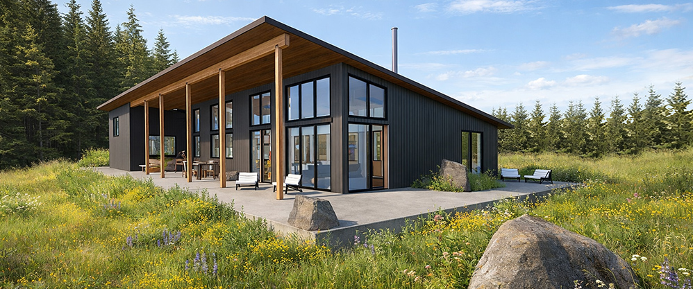 The Umatilla Residence is a new construction project for a couple and their family dog. The clients had a desire to encompass the main residence and their garage/studio with a large roof that would provide ample year-round functional covered space, as well as maximize structural proficiency. The main house includes; 2 bedrooms/2 baths and an office space in a very efficient 1400 sf. The structure's large shed roof slopes North to South to take full advantage of views to the north into the adjacent natural area. The Shed roof provides generous defused light in the main living space, as well as optimizes solar angles for a large solar array. The structure allows for an optimal structural efficiency while promoting the desired open floor plan concept desired by the clients. Cabinetry and storage are efficiently nested within the public/private dividing wall that also serves as the main load bearing element of the residence. The 2-car garage/studio provides a parking and workshop space for the client’s various sprinter van projects. Large cut away pockets within the roof structure provide daylighting to the covered porch areas, as well as serve as low light planting areas.